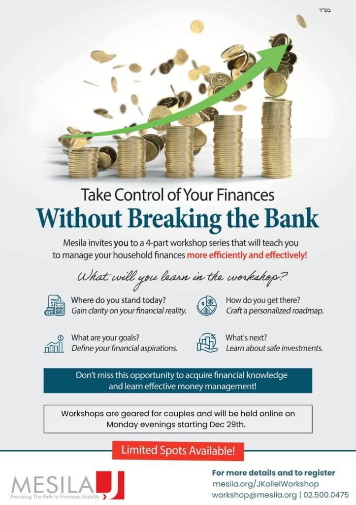 Mesila invites you to a 4-part workshop series geared for couples starting Monday, Decemer 29th. You’ll learn how to keep track of your current financial picture, create a money vision, and craft a personalized plan for success. Plus basics of investments.